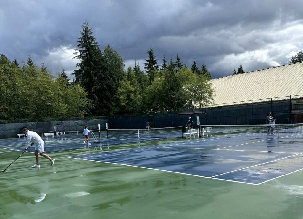 Day 11 brought the dreaded rain-two rain delays for the National Junior Open Series (NJOS) Fortunately, many hands and a crew of willing volunteers meant that teams got to work as soon as the rain stopped to dry the courts. Despite the late start, only three of the matches scheduled for the day didn’t finish. It’s always important to have a contingency plan, and in order to get (almost) all the matches in, courts were provided at UBC and Hollyburn Tennis Club. It was a herculean effort by the team at Tennis BC!