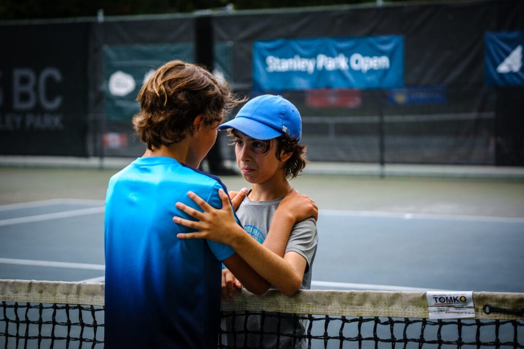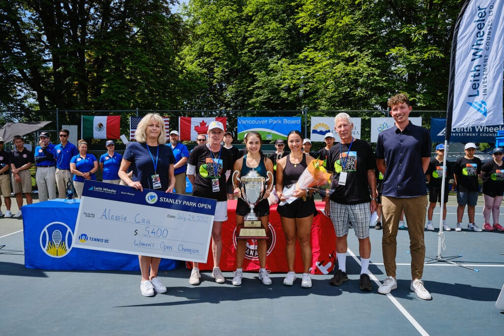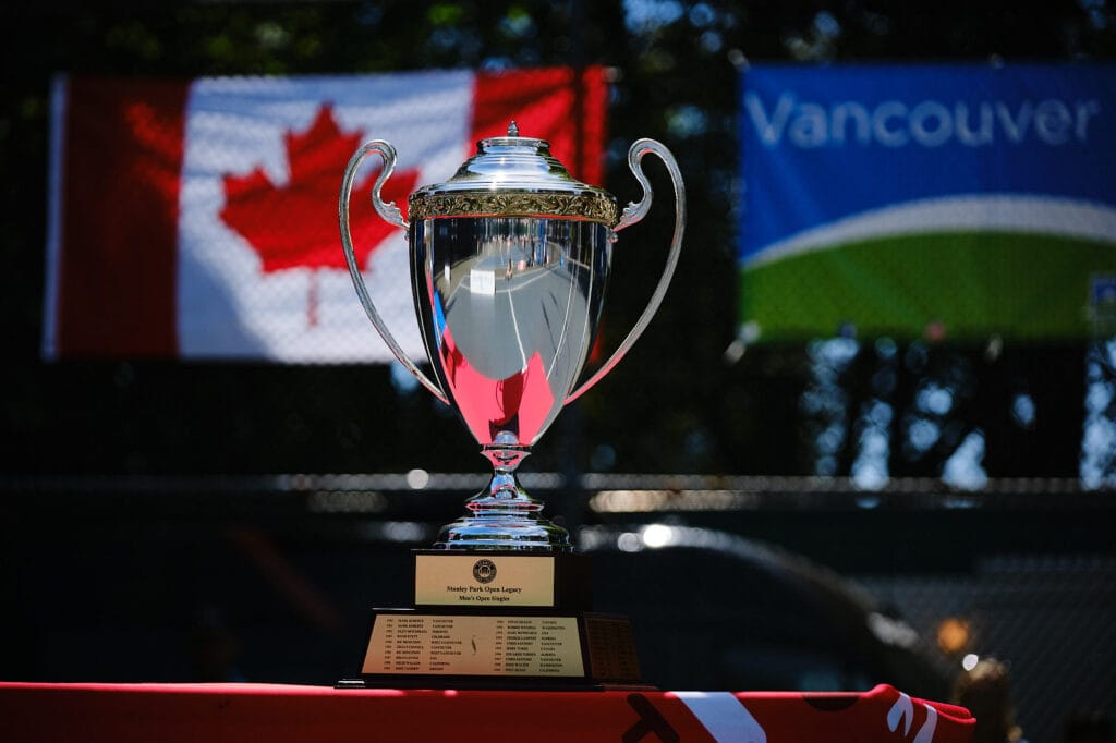 Centre court was prepared with trophy tables, umpire’s chairs, sponsor signs and score cards. As match time approached, an army of officials began to gather along with a group of ball kids–the atmosphere was charged–it was time for the players to take the court. Commentary for the live stream was provided by local legend and past Stanley Park Open Champion, Robert Bettauer.